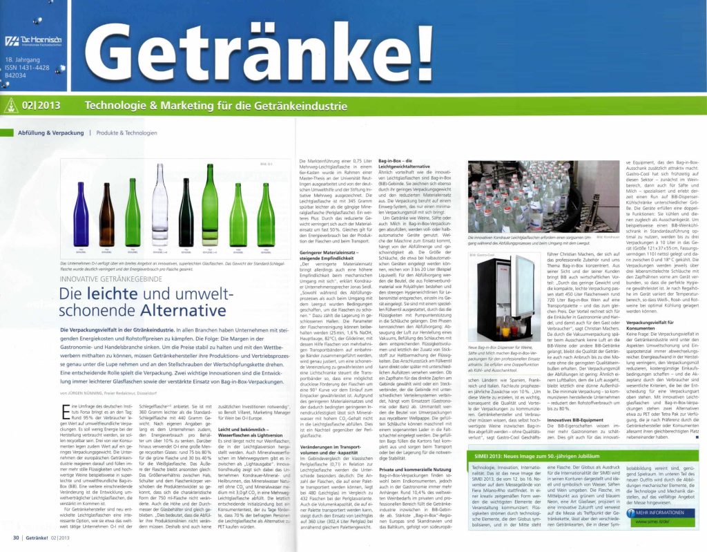In der Ausgabe 2/2013 der Fachzeitschrift "Getränke!" werden Back-in-Box-Systeme als leichte und umweltschonende Verpackungsalternative für die Getränkeindustrie vorgestellt.