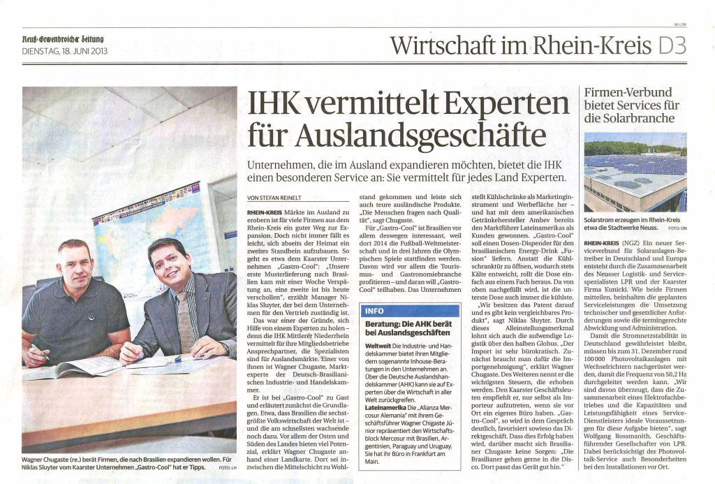 Wie erschließt man Märkte im Ausland? Und wie kann Gastro-Cool sein Geschäft nach Brasilien expandieren? Wir sprachen mit einem Experten von der IHK Mittlerer Niederrhein – und die NGZ hat darüber berichtet.