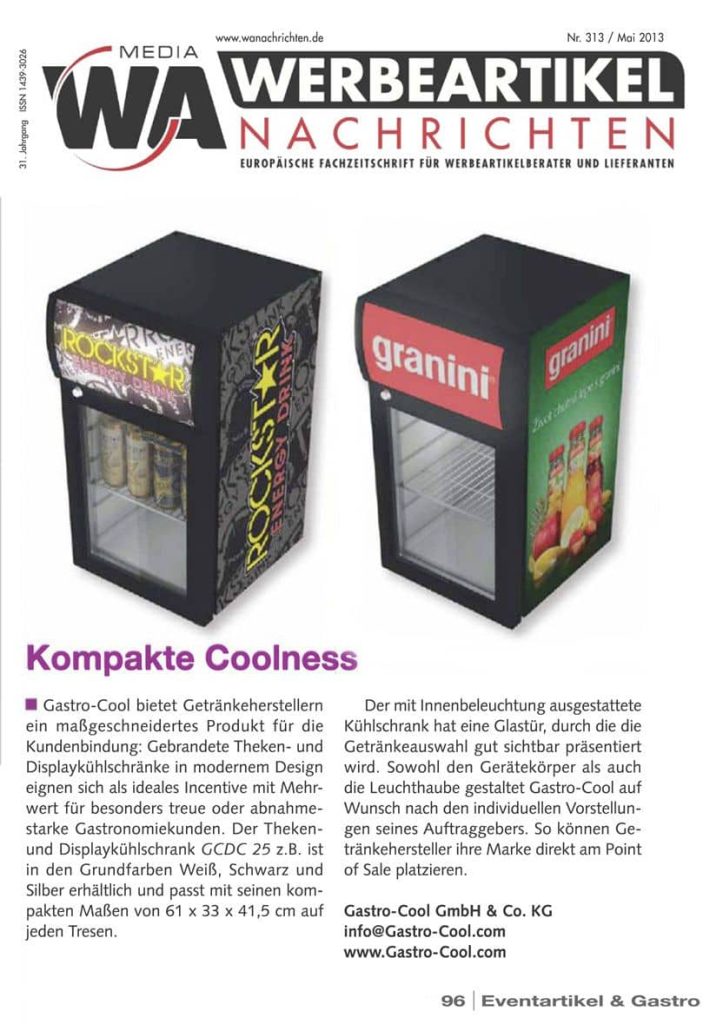 Die Werbeartikel-Nachrichten berichten in ihrer Mai-Ausgabe über den Theken- und Displaykühlschrank GCDC 25 von Gastro-Cool: