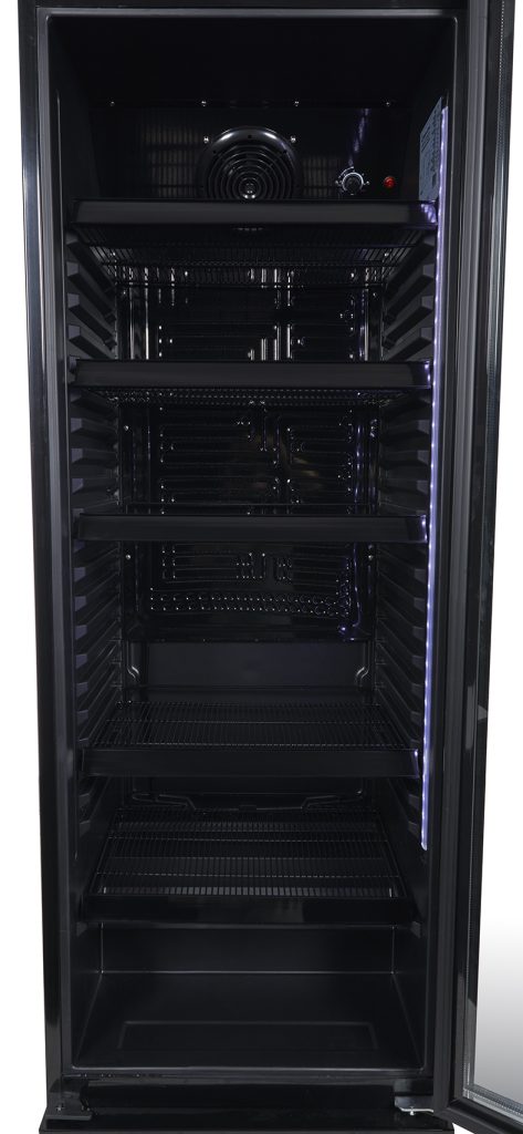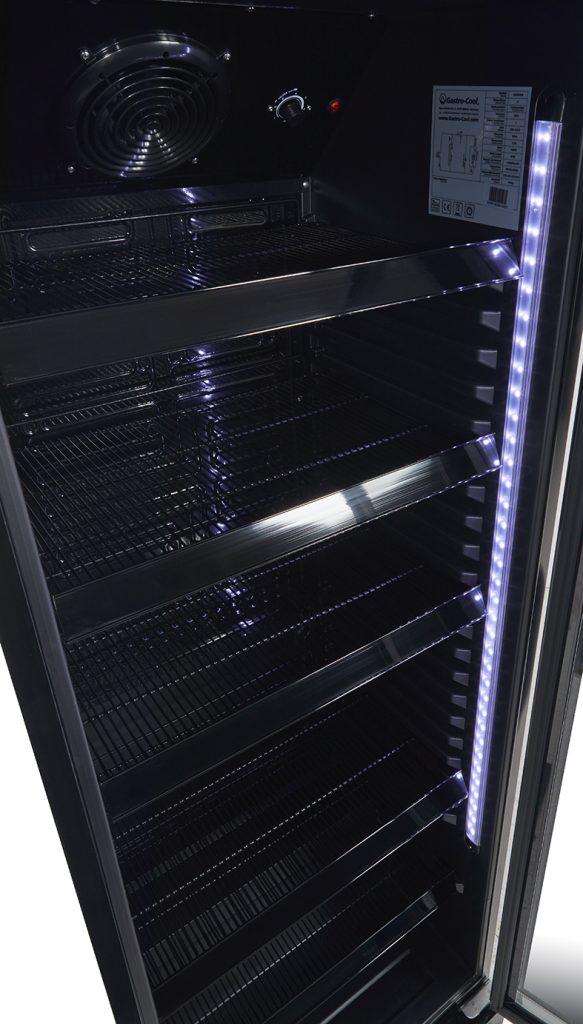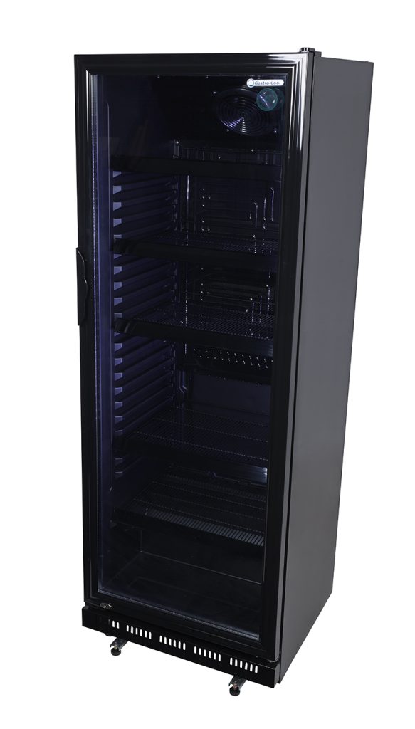 Der GCGD360 bietet 339 Liter Nutzinhalt für professionellen Gastrobetrieb. Die selbstschließende Glastür hält die Kälte im Gerät und gibt zugleich den Blick auf das gekühlte Sortiment frei. Fünf höhenverstellbare Gitterablagen passen sich an jede Flaschengröße an.