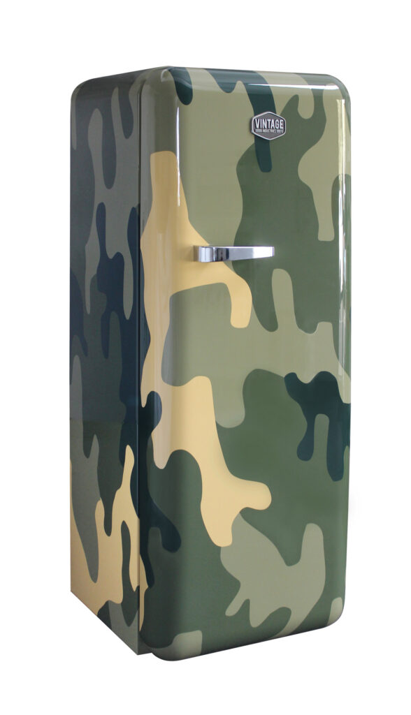 "Army look fridge-freezer - for tough ladies and tough guys The retro refrigerator ""Jungle"" looks as if it had been forgotten during…